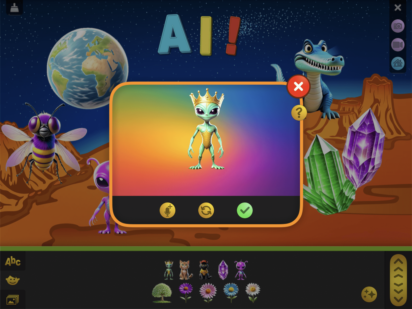 Ti basta descrivere il magnete con la tua voce, ad esempio "un alieno verde con la corona", e in pochi secondi vedrai comparire il tuo nuovo magnete, pronto da spostare e giocare sulla lavagna!